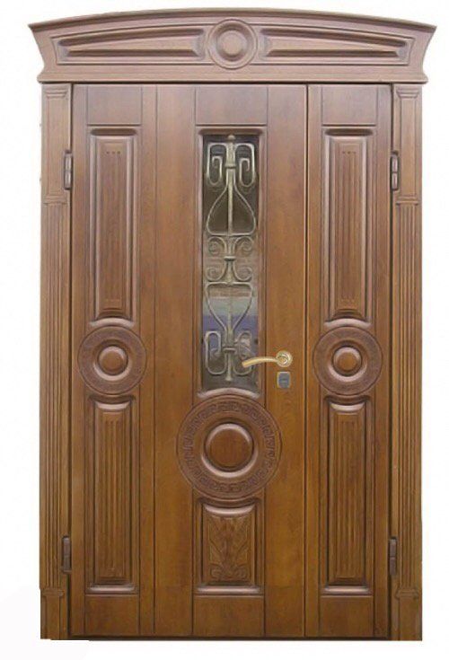 Поскольку в большинстве случаев устанавливаемые на входе в коттедж двустворчатые двери являются еще и предметом интерьера, украшающим здание, их дизайну предается особое значение. Эти двери, как правило, отделываются атмосферостойким МДФ, натуральным шпоном, массивом. Эффектно на таких дверях смотрится витражный узор, применение ковки, зеркальных элементов. Вариантов декора входной двустворчатой двери масса, тут все зависит от пожеланий заказчика.